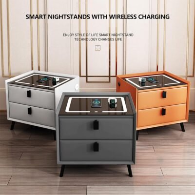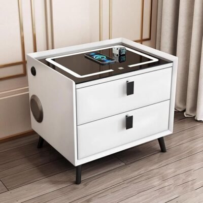 Chevet Bluetooth avec chargement sans fil Table de chargeur USB Lumières LED 2 tiroirs de rangement Blanc